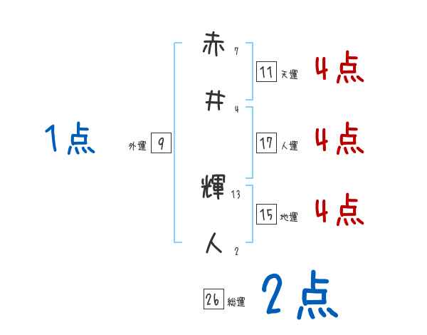 天運![]() | 赤井輝人さんの天運は11画の4つ星!着実に富や地位を得る幸運な人生。 家系が持つ宿命的な運勢を表します。祖先から受け継いだ苗字ですので自分の力が及びません。家柄を象徴します。 |