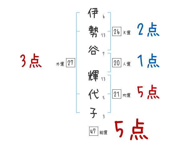 外運![]() | 伊勢谷輝代子さんの外運は27画の3つ星!頭脳明晰だが強情で摩擦が多い傾向。孤立に注意。 生活面を象徴する運勢です。外部から受ける影響力を表し、結婚運、家庭運や職場、環境への順応性を表します。 |