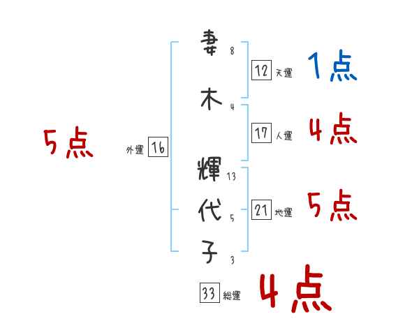 外運![]() | 妻木輝代子さんの外運は16画の5つ星!人望が厚く大きく発展する。逆転成功が見える。 生活面を象徴する運勢です。外部から受ける影響力を表し、結婚運、家庭運や職場、環境への順応性を表します。 |