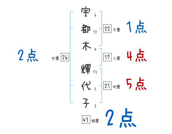 総運![]() | 宇都木輝代子さんの総運は43画の2つ星!頑固な性格で独立心が強いかも。やや非現実的で浪費に注意しましょう。 あなたの人生を表す1番重要な運勢です。生涯を通じて影響する総合運となり、主に50歳以降の晩年期に影響を及ぼします。 |