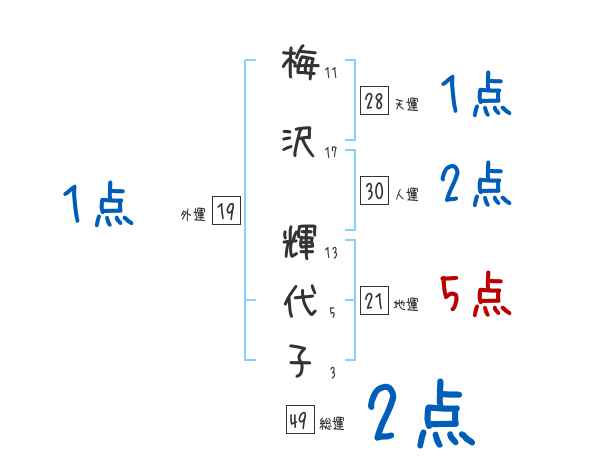 天運![]() | 梅沢輝代子さんの天運は28画の1つ星!家庭環境に注意。スポーツで活躍できる能力があるかも。 家系が持つ宿命的な運勢を表します。祖先から受け継いだ苗字ですので自分の力が及びません。家柄を象徴します。 |