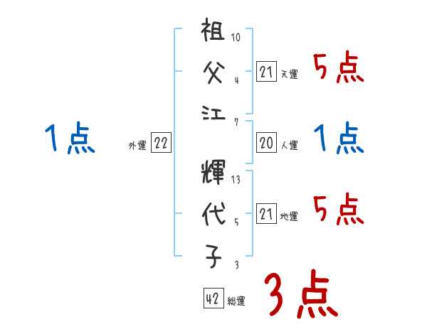 | 天運  | 祖父江輝代子さんの天運は21画の5つ星!統率力がある。独立し成功する。名誉を手に入れる。家系が持つ宿命的な運勢を表します。祖先から受け継いだ苗字ですので自分の力が及びません。家柄を象徴します。 |