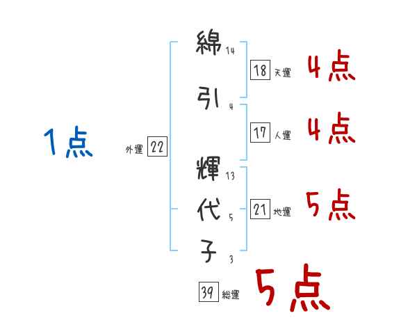 天運![]() | 綿引輝代子さんの天運は18画の4つ星!情熱的で剛気。忍耐力があり信頼される。 家系が持つ宿命的な運勢を表します。祖先から受け継いだ苗字ですので自分の力が及びません。家柄を象徴します。 |
