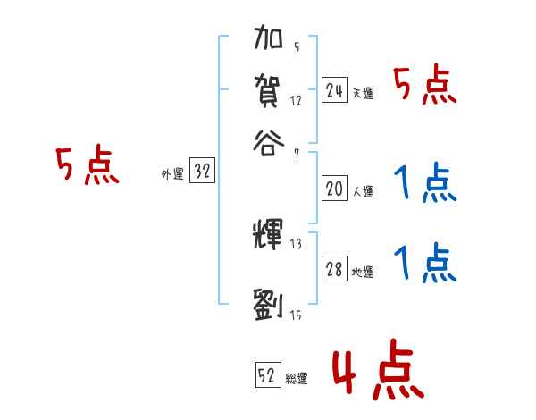 外運![]() | 加賀谷輝劉さんの外運は32画の5つ星!柔軟性があり成功する。チャンスが多く金運が良い。 生活面を象徴する運勢です。外部から受ける影響力を表し、結婚運、家庭運や職場、環境への順応性を表します。 |