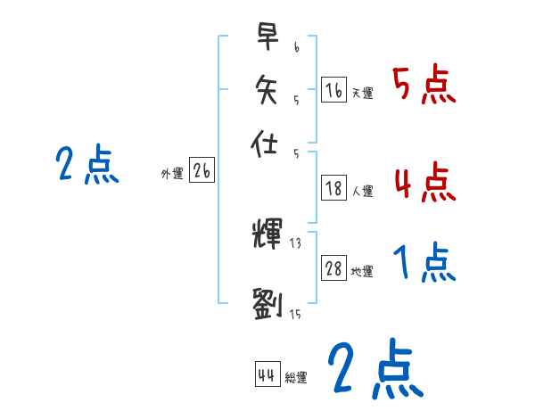 地運![]() | 早矢仕輝劉さんの地運は28画の1つ星!家庭環境に注意。スポーツで活躍できる能力があるかも。 個性を表す基礎的な運勢です。性格形成や対人関係、行動力など家庭環境に影響されます。主に誕生してから20歳くらいまでの若年期の運勢を表します。 |