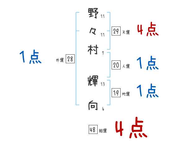 天運![]() | 野々村輝向さんの天運は29画の4つ星!完全主義で才能がある。厳格な心の持ち主。 家系が持つ宿命的な運勢を表します。祖先から受け継いだ苗字ですので自分の力が及びません。家柄を象徴します。 |