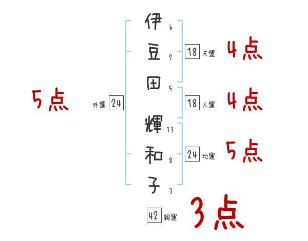 外運![]() | 伊豆田輝和子さんの外運は24画の5つ星!家庭運が良く順調な人生。金運にも恵まれる。 生活面を象徴する運勢です。外部から受ける影響力を表し、結婚運、家庭運や職場、環境への順応性を表します。 |