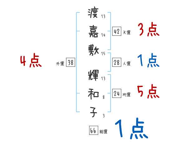 人運![]() | 渡嘉敷輝和子さんの人運は28画の1つ星!家庭環境に注意。スポーツで活躍できる能力があるかも。 性格や才能などを表す2番目に重要な運勢です。人間関係や協調性、社会的な成功に影響します。主に20歳から50歳ぐらいまでの中年期の運勢を表します。 |