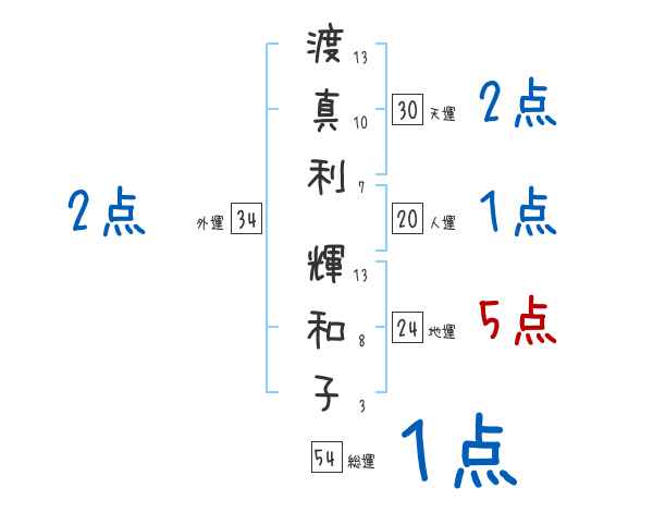 総運![]() | 渡真利輝和子さんの総運は54画の1つ星!トラブルが多いかも。周りをよく見て協調して過ごしましょう。 あなたの人生を表す1番重要な運勢です。生涯を通じて影響する総合運となり、主に50歳以降の晩年期に影響を及ぼします。 |
