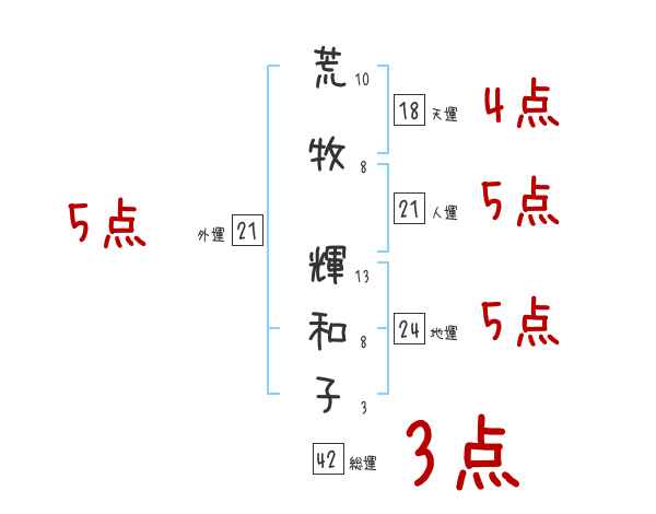 人運![]() | 荒牧輝和子さんの人運は21画の5つ星!統率力がある。独立し成功する。名誉を手に入れる。 性格や才能などを表す2番目に重要な運勢です。人間関係や協調性、社会的な成功に影響します。主に20歳から50歳ぐらいまでの中年期の運勢を表します。 |