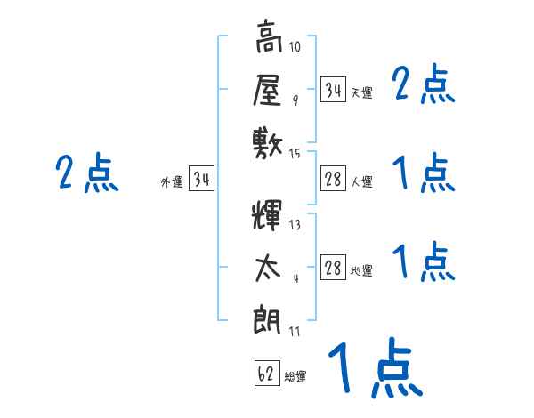 人運![]() | 高屋敷輝太朗さんの人運は28画の1つ星!家庭環境に注意。スポーツで活躍できる能力があるかも。 性格や才能などを表す2番目に重要な運勢です。人間関係や協調性、社会的な成功に影響します。主に20歳から50歳ぐらいまでの中年期の運勢を表します。 |