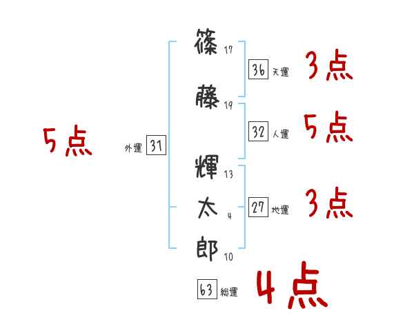人運![]() | 篠藤輝太郎さんの人運は32画の5つ星!柔軟性があり成功する。チャンスが多く金運が良い。 性格や才能などを表す2番目に重要な運勢です。人間関係や協調性、社会的な成功に影響します。主に20歳から50歳ぐらいまでの中年期の運勢を表します。 |