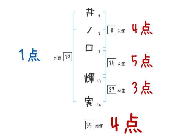 外運![]() | 井ノ口輝実さんの外運は19画の1つ星!優れた才能を持ちますが、協調性が足りないことも。周りの人と協力する事を意識しましょう。 生活面を象徴する運勢です。外部から受ける影響力を表し、結婚運、家庭運や職場、環境への順応性を表します。 |