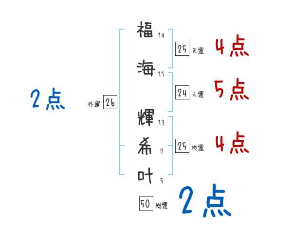 天運![]() | 福海輝希叶さんの天運は25画の4つ星!個性があり才能があふれる。強運の持ち主で発展する。 家系が持つ宿命的な運勢を表します。祖先から受け継いだ苗字ですので自分の力が及びません。家柄を象徴します。 |
