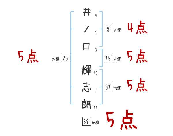 総運![]() | 井ノ口輝志朗さんの総運は39画の5つ星!社交性に優れ人望が厚い。人の上に立ち成功する。 あなたの人生を表す1番重要な運勢です。生涯を通じて影響する総合運となり、主に50歳以降の晩年期に影響を及ぼします。 |