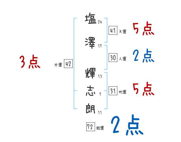 外運![]() | 塩澤輝志朗さんの外運は42画の3つ星!病気に注意。多芸であるが消極的でおとなしい。 生活面を象徴する運勢です。外部から受ける影響力を表し、結婚運、家庭運や職場、環境への順応性を表します。 |