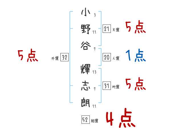 外運![]() | 小野谷輝志朗さんの外運は32画の5つ星!柔軟性があり成功する。チャンスが多く金運が良い。 生活面を象徴する運勢です。外部から受ける影響力を表し、結婚運、家庭運や職場、環境への順応性を表します。 |