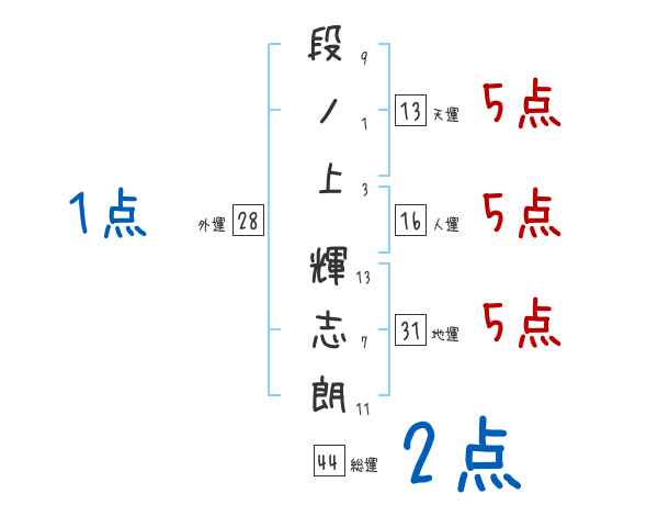 総運![]() | 段ノ上輝志朗さんの総運は44画の2つ星!誠実で慎重な性格。物事を考えすぎないように注意しましょう。 あなたの人生を表す1番重要な運勢です。生涯を通じて影響する総合運となり、主に50歳以降の晩年期に影響を及ぼします。 |