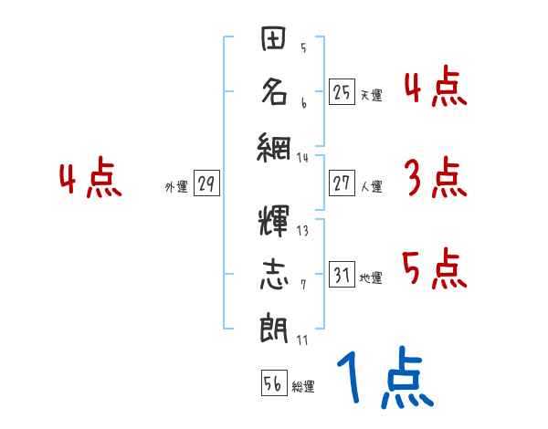 総運![]() | 田名網輝志朗さんの総運は56画の1つ星!消極的で無気力になりがち。誠実な気持ちが必要でしょう。 あなたの人生を表す1番重要な運勢です。生涯を通じて影響する総合運となり、主に50歳以降の晩年期に影響を及ぼします。 |