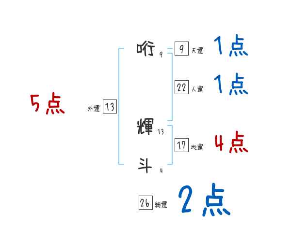 外運![]() | 哘輝斗さんの外運は13画の5つ星!才能に恵まれ人気がある。名声を手に入れる。円満な人生。 生活面を象徴する運勢です。外部から受ける影響力を表し、結婚運、家庭運や職場、環境への順応性を表します。 |
