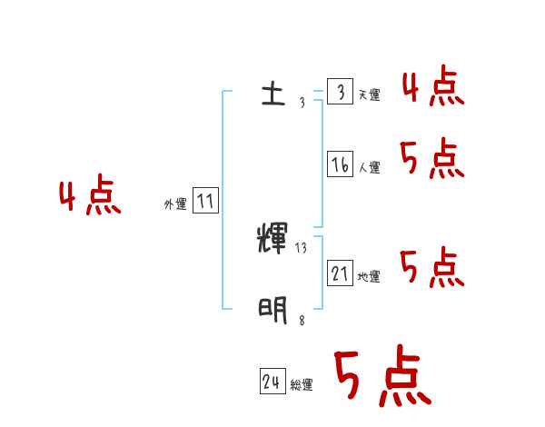 天運![]() | 土輝明さんの天運は3画の4つ星!活動的で才能に恵まれ、多くの信頼を得る。希望に満ち成長する。 家系が持つ宿命的な運勢を表します。祖先から受け継いだ苗字ですので自分の力が及びません。家柄を象徴します。 |