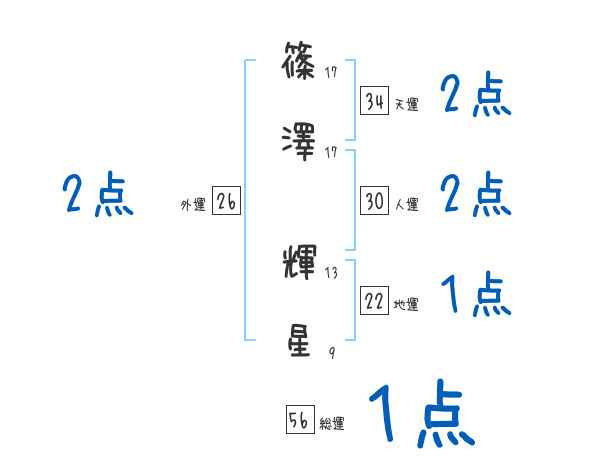 外運![]() | 篠澤輝星さんの外運は26画の2つ星!波瀾万丈かも。信頼できる人を大事にしましょう。 生活面を象徴する運勢です。外部から受ける影響力を表し、結婚運、家庭運や職場、環境への順応性を表します。 |