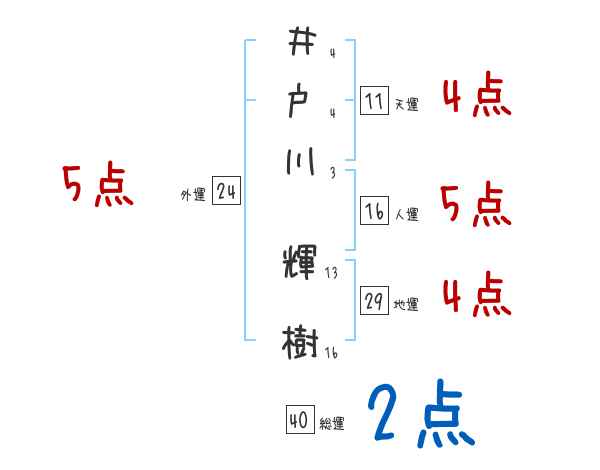 人運![]() | 井戸川輝樹さんの人運は16画の5つ星!人望が厚く大きく発展する。逆転成功が見える。 性格や才能などを表す2番目に重要な運勢です。人間関係や協調性、社会的な成功に影響します。主に20歳から50歳ぐらいまでの中年期の運勢を表します。 |