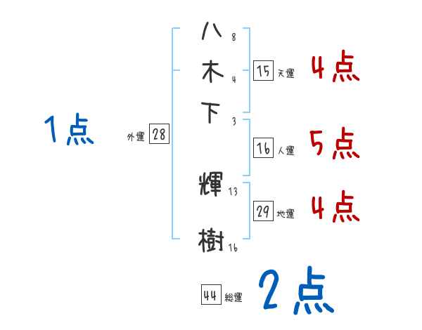 総運![]() | 八木下輝樹さんの総運は44画の2つ星!誠実で慎重な性格。物事を考えすぎないように注意しましょう。 あなたの人生を表す1番重要な運勢です。生涯を通じて影響する総合運となり、主に50歳以降の晩年期に影響を及ぼします。 |