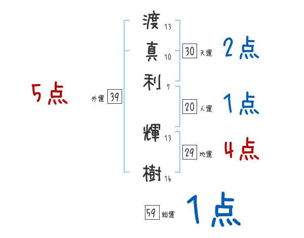 外運![]() | 渡真利輝樹さんの外運は39画の5つ星!社交性に優れ人望が厚い。人の上に立ち成功する。 生活面を象徴する運勢です。外部から受ける影響力を表し、結婚運、家庭運や職場、環境への順応性を表します。 |