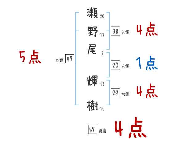 外運![]() | 瀬野尾輝樹さんの外運は47画の5つ星!実力が開花し発展する円満な人生。財に恵まれる。 生活面を象徴する運勢です。外部から受ける影響力を表し、結婚運、家庭運や職場、環境への順応性を表します。 |