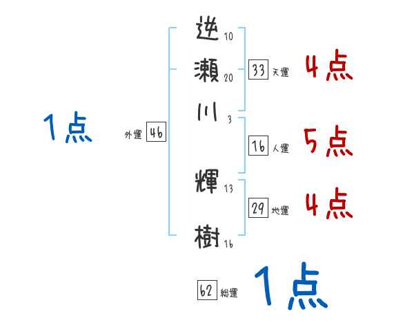 人運![]() | 逆瀬川輝樹さんの人運は16画の5つ星!人望が厚く大きく発展する。逆転成功が見える。 性格や才能などを表す2番目に重要な運勢です。人間関係や協調性、社会的な成功に影響します。主に20歳から50歳ぐらいまでの中年期の運勢を表します。 |