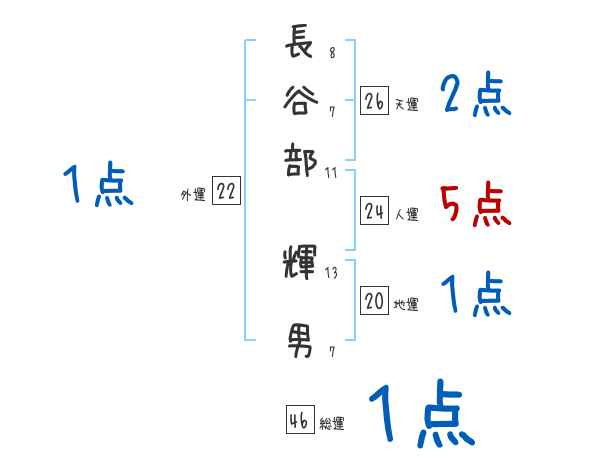総運![]() | 長谷部輝男さんの総運は46画の1つ星!迷走することが多く苦労するかも。目先のことにとらわれないように。 あなたの人生を表す1番重要な運勢です。生涯を通じて影響する総合運となり、主に50歳以降の晩年期に影響を及ぼします。 |