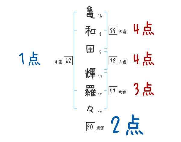 総運![]() | 亀和田輝羅々さんの総運は80画の2つ星!病弱で健康に注意。多少苦労することがあるかも。 あなたの人生を表す1番重要な運勢です。生涯を通じて影響する総合運となり、主に50歳以降の晩年期に影響を及ぼします。 |