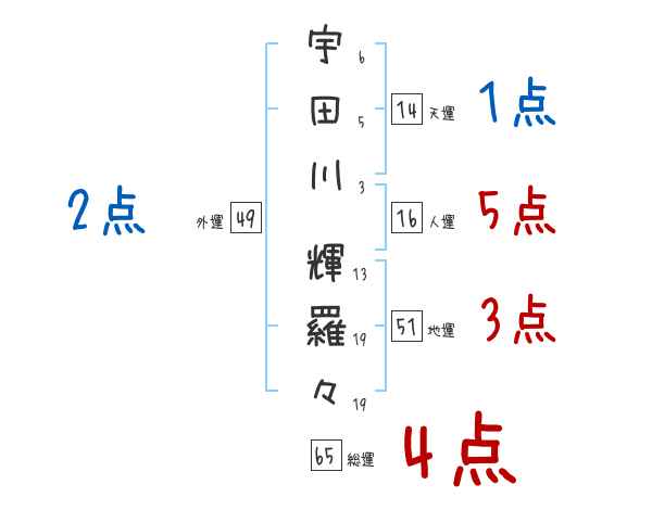 総運![]() | 宇田川輝羅々さんの総運は65画の4つ星!幸運に恵まれ繁栄する。包容力がある。 あなたの人生を表す1番重要な運勢です。生涯を通じて影響する総合運となり、主に50歳以降の晩年期に影響を及ぼします。 |