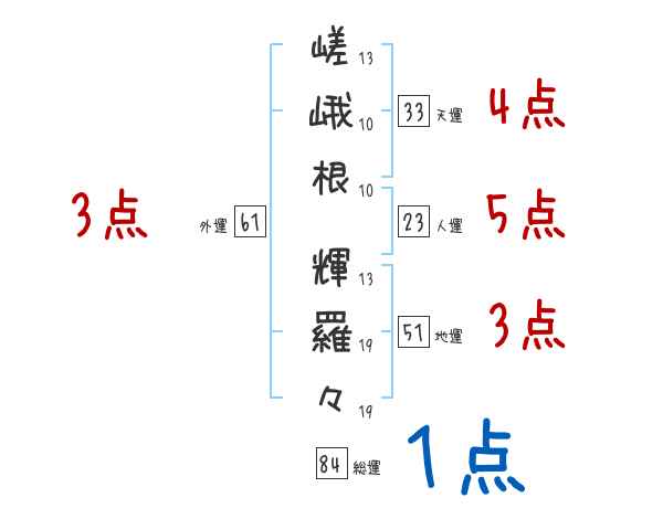 人運![]() | 嵯峨根輝羅々さんの人運は23画の5つ星!想像力に優れ活力がある。一代で成功し名誉を手に入れる。 性格や才能などを表す2番目に重要な運勢です。人間関係や協調性、社会的な成功に影響します。主に20歳から50歳ぐらいまでの中年期の運勢を表します。 |