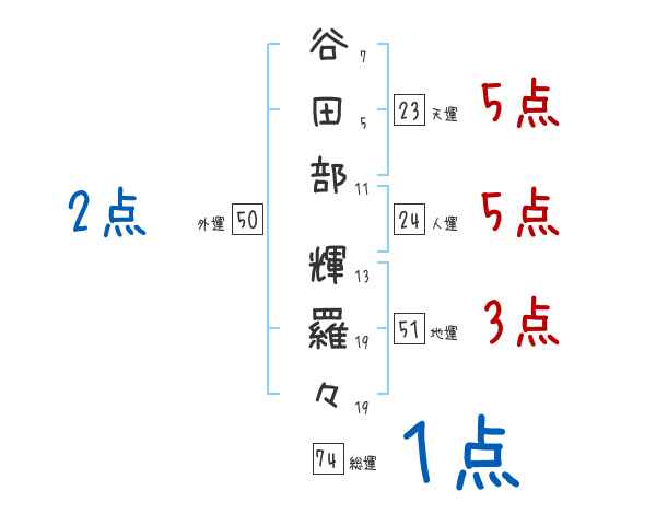 谷田部輝羅々さんの画数の鑑定結果