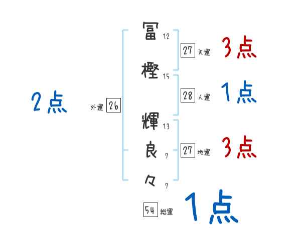 外運![]() | 冨樫輝良々さんの外運は26画の2つ星!波瀾万丈かも。信頼できる人を大事にしましょう。 生活面を象徴する運勢です。外部から受ける影響力を表し、結婚運、家庭運や職場、環境への順応性を表します。 |