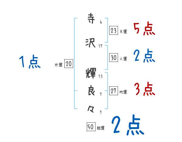 天運![]() | 寺沢輝良々さんの天運は23画の5つ星!想像力に優れ活力がある。一代で成功し名誉を手に入れる。 家系が持つ宿命的な運勢を表します。祖先から受け継いだ苗字ですので自分の力が及びません。家柄を象徴します。 |