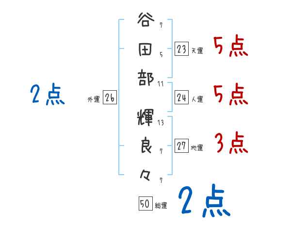 外運![]() | 谷田部輝良々さんの外運は26画の2つ星!波瀾万丈かも。信頼できる人を大事にしましょう。 生活面を象徴する運勢です。外部から受ける影響力を表し、結婚運、家庭運や職場、環境への順応性を表します。 |
