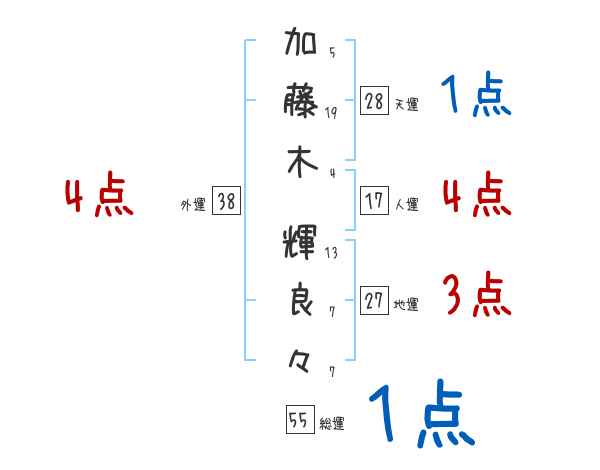 天運![]() | 加藤木輝良々さんの天運は28画の1つ星!家庭環境に注意。スポーツで活躍できる能力があるかも。 家系が持つ宿命的な運勢を表します。祖先から受け継いだ苗字ですので自分の力が及びません。家柄を象徴します。 |