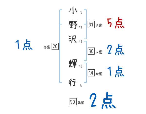天運![]() | 小野沢輝行さんの天運は31画の5つ星!社交性があり判断力に優れる。順風満帆な人生で円満な生活。 家系が持つ宿命的な運勢を表します。祖先から受け継いだ苗字ですので自分の力が及びません。家柄を象徴します。 |