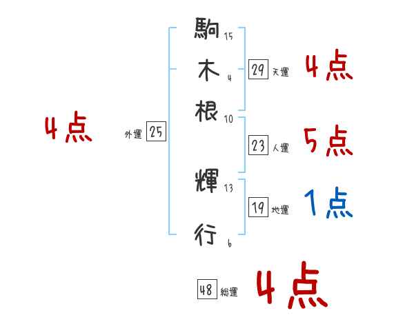 天運![]() | 駒木根輝行さんの天運は29画の4つ星!完全主義で才能がある。厳格な心の持ち主。 家系が持つ宿命的な運勢を表します。祖先から受け継いだ苗字ですので自分の力が及びません。家柄を象徴します。 |