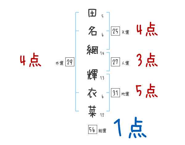 天運![]() | 田名網輝衣菜さんの天運は25画の4つ星!個性があり才能があふれる。強運の持ち主で発展する。 家系が持つ宿命的な運勢を表します。祖先から受け継いだ苗字ですので自分の力が及びません。家柄を象徴します。 |