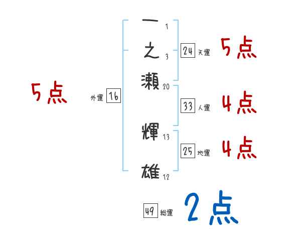 天運![]() | 一之瀬輝雄さんの天運は24画の5つ星!家庭運が良く順調な人生。金運にも恵まれる。 家系が持つ宿命的な運勢を表します。祖先から受け継いだ苗字ですので自分の力が及びません。家柄を象徴します。 |