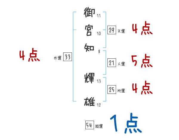 外運![]() | 御宮知輝雄さんの外運は33画の4つ星!権力志向でプライドが高い。勇気があり運を切り開き成功する。 生活面を象徴する運勢です。外部から受ける影響力を表し、結婚運、家庭運や職場、環境への順応性を表します。 |