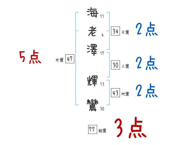 総運![]() | 海老澤輝鸞さんの総運は77画の3つ星!多少不安定であるが晩年は吉。不屈の精神。 あなたの人生を表す1番重要な運勢です。生涯を通じて影響する総合運となり、主に50歳以降の晩年期に影響を及ぼします。 |