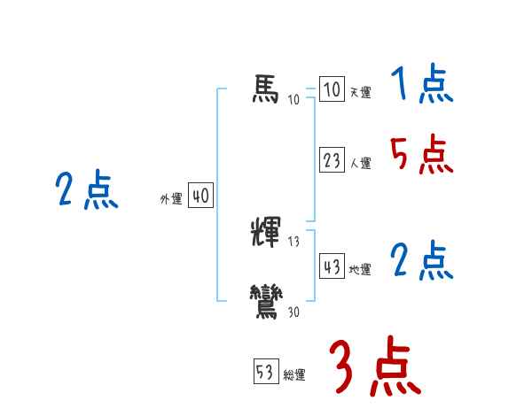 総運![]() | 馬輝鸞さんの総運は53画の3つ星!やや見栄っ張りで虚栄心がある。散財に注意。 あなたの人生を表す1番重要な運勢です。生涯を通じて影響する総合運となり、主に50歳以降の晩年期に影響を及ぼします。 |