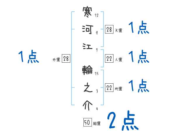 天運![]() | 寒河江輪之介さんの天運は28画の1つ星!家庭環境に注意。スポーツで活躍できる能力があるかも。 家系が持つ宿命的な運勢を表します。祖先から受け継いだ苗字ですので自分の力が及びません。家柄を象徴します。 |