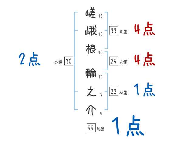 外運![]() | 嵯峨根輪之介さんの外運は30画の2つ星!浮き沈みの激しさに注意しましょう。 生活面を象徴する運勢です。外部から受ける影響力を表し、結婚運、家庭運や職場、環境への順応性を表します。 |