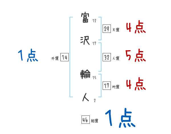 天運![]() | 富沢輪人さんの天運は29画の4つ星!完全主義で才能がある。厳格な心の持ち主。 家系が持つ宿命的な運勢を表します。祖先から受け継いだ苗字ですので自分の力が及びません。家柄を象徴します。 |